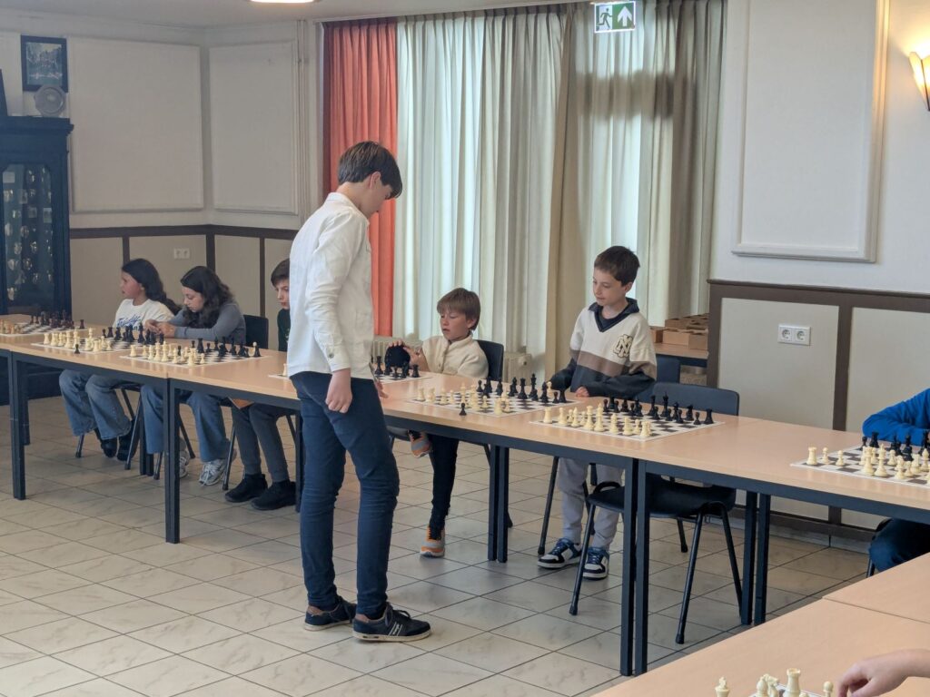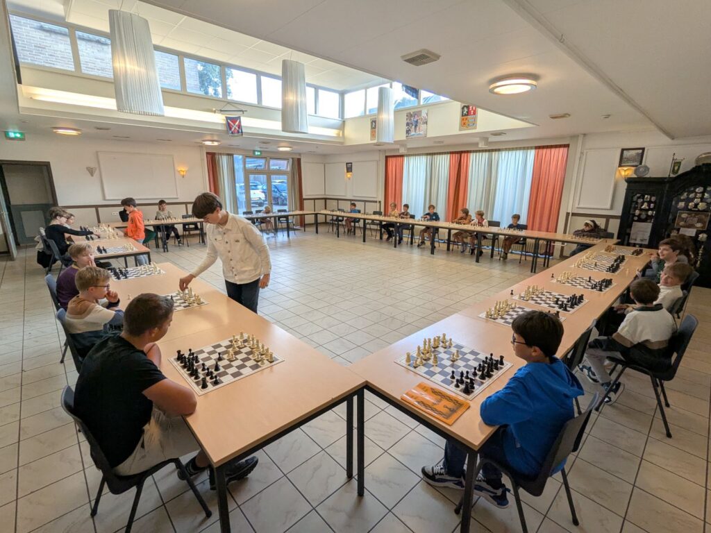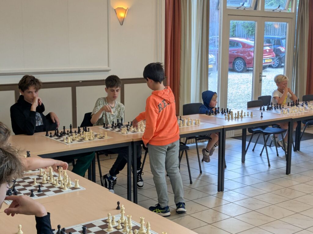 Afgelopen vrijdag werd voorafgaand aan het simultaan bij de senioren, ook een simultaan gegeven door de jeugdclubkampioen van het afgelopen seizoen: Frank Terlouw. Om de vaart er een beetje in te houden, had hij Jurian (stap 5) gevraagd de helft van de borden voor zijn rekening te nemen. Hoewel Frank en Jurian dus beiden een simultaan (zonder klok) tegen meer dan 10 kinderen moesten spelen, bleken ze aan het einde beide ongeslagen. Het waren Pepijn en Hewie die de meeste weerstand boden en goed speelden, maar uiteindelijk ook het onderspit moesten delven.